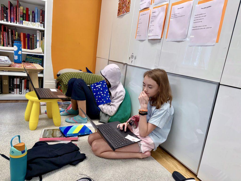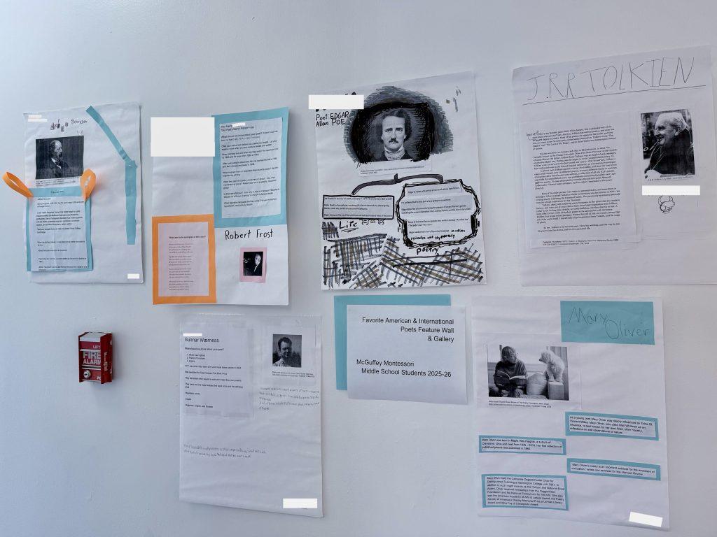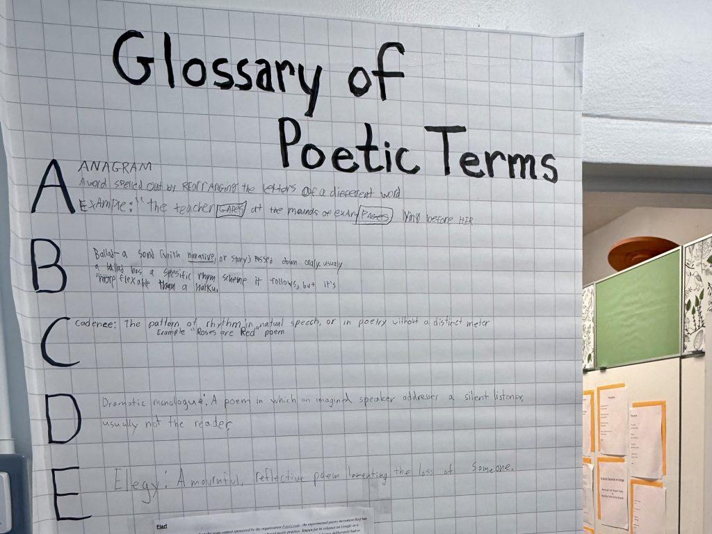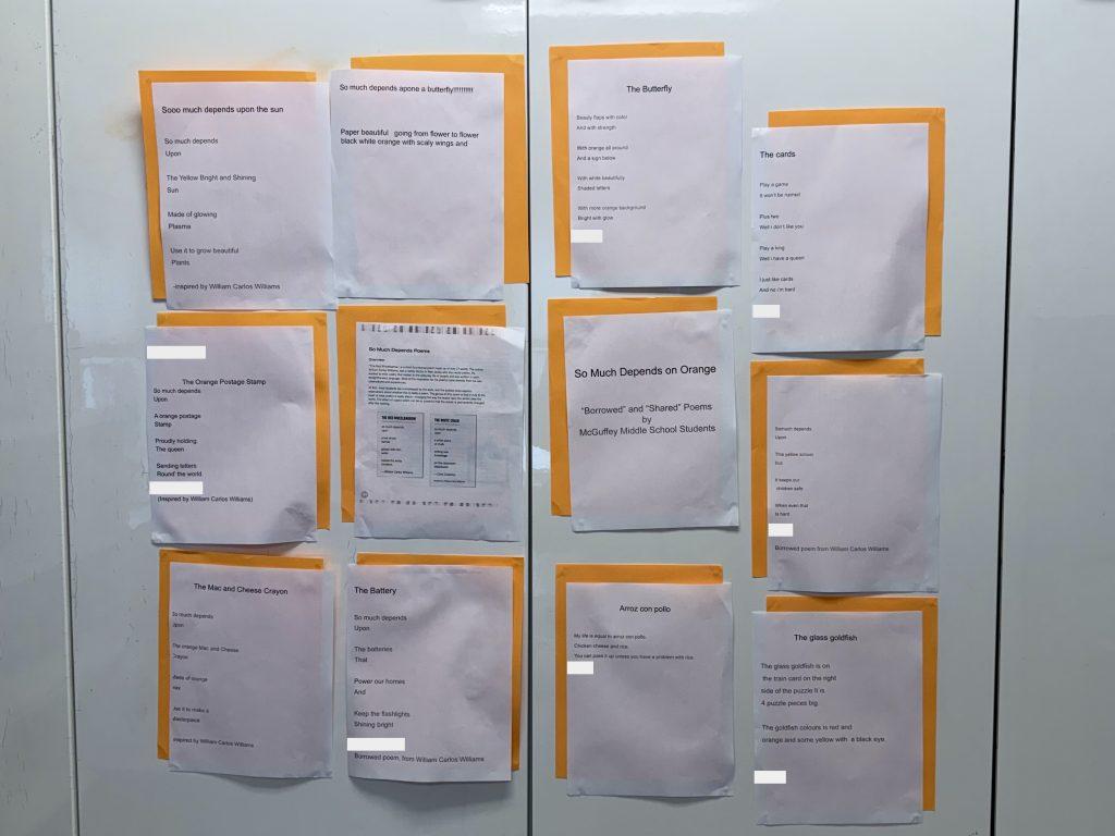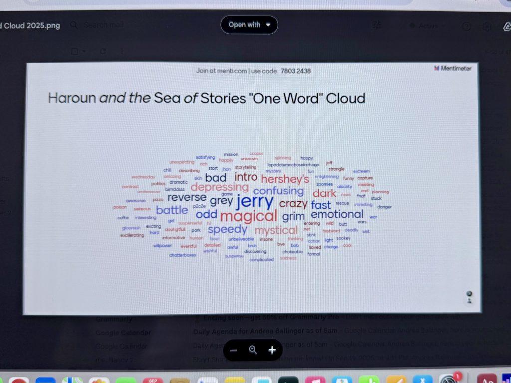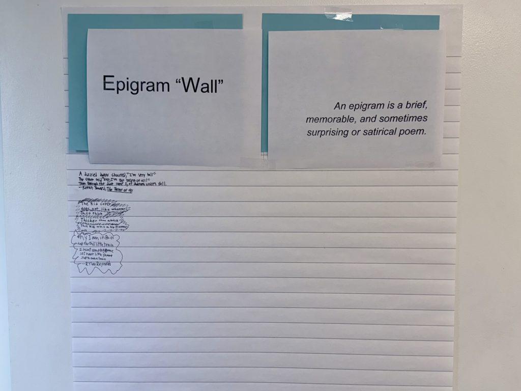 Middle School students are writing, creating, and studying poetry. They are working together to compile a list of poetic terms. Favorite poets have been identified and poems have been written in the style of famous poems. Content from their current science unit on cells and DNA is being used to black out words and create a type poetry called Blackout Poetry. The Epigram Wall is being added to daily. So Much Depends poems are being written and hung in the Orange Room. A Cloud Poem has been created by the entire class based on their summer reading book, Haroun and the Sea of Stories. During their study of the book, students wrote down one word from each chapter that caught their imagination. Those words were collected and collectively entered to form the poem. The Poetry unit will wrap up this week and lead into Short Stories.