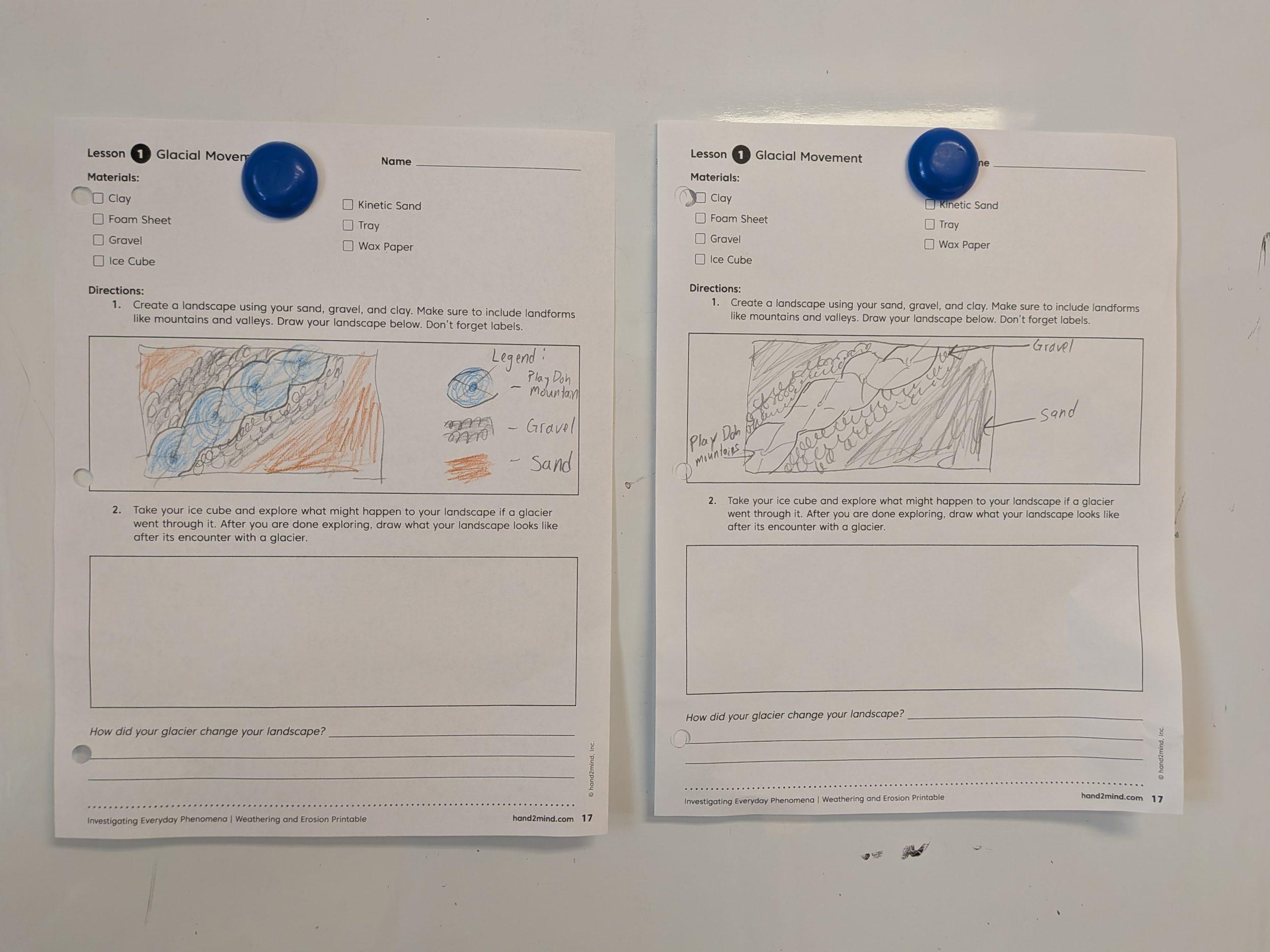 As Upper Elementary continues to study Earth Sciences, they created models to demonstrate how glaciers affect the land. Using modeling clay, kinetic sand, gravel, and a large ice cube, they observed how the movement of a glacier changes the surrounding landscape and what the landscape may look like as the glacier melts. It was a fun, hands-on activity to show how the Earth came to look the way it does.