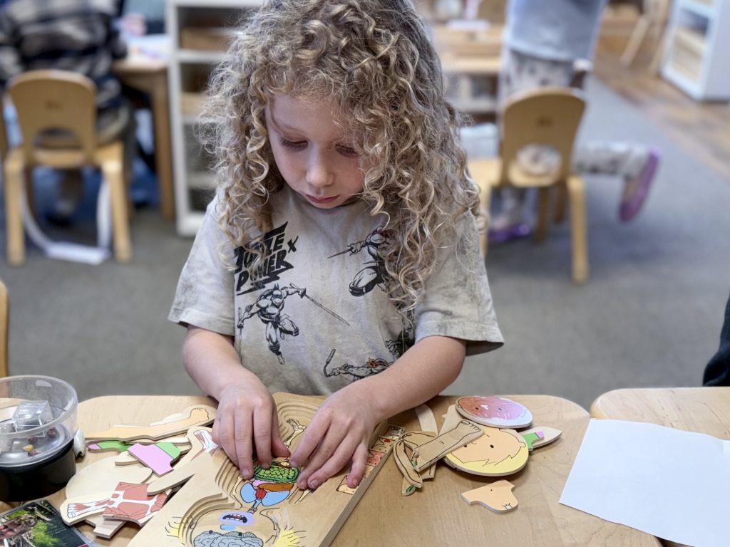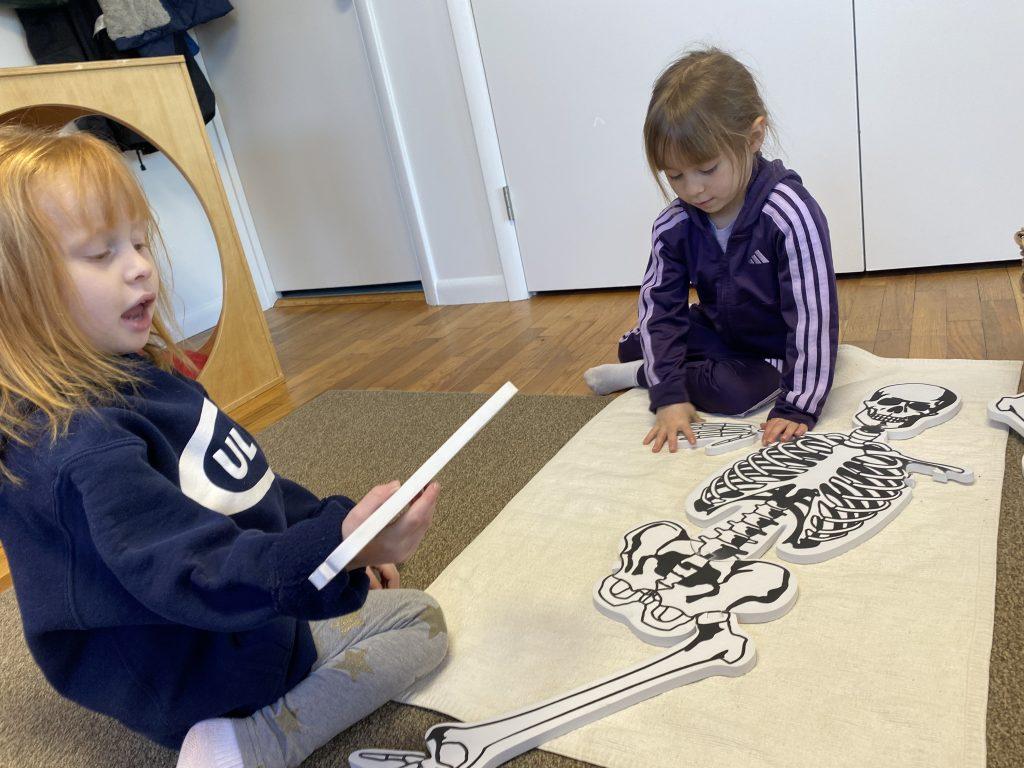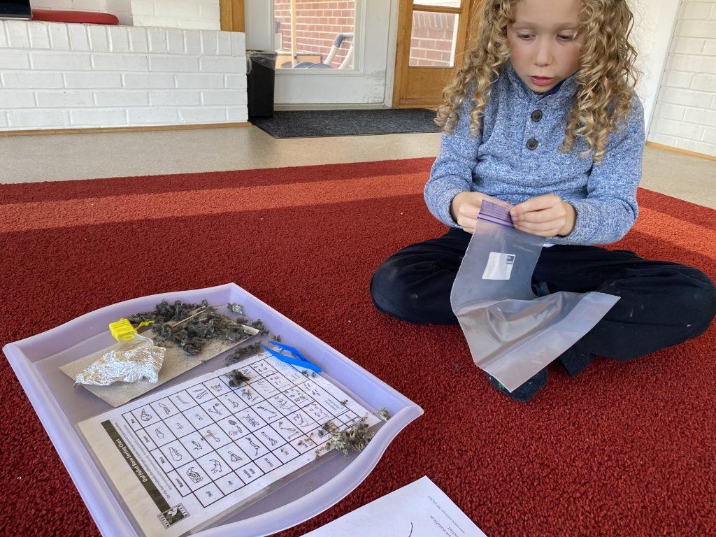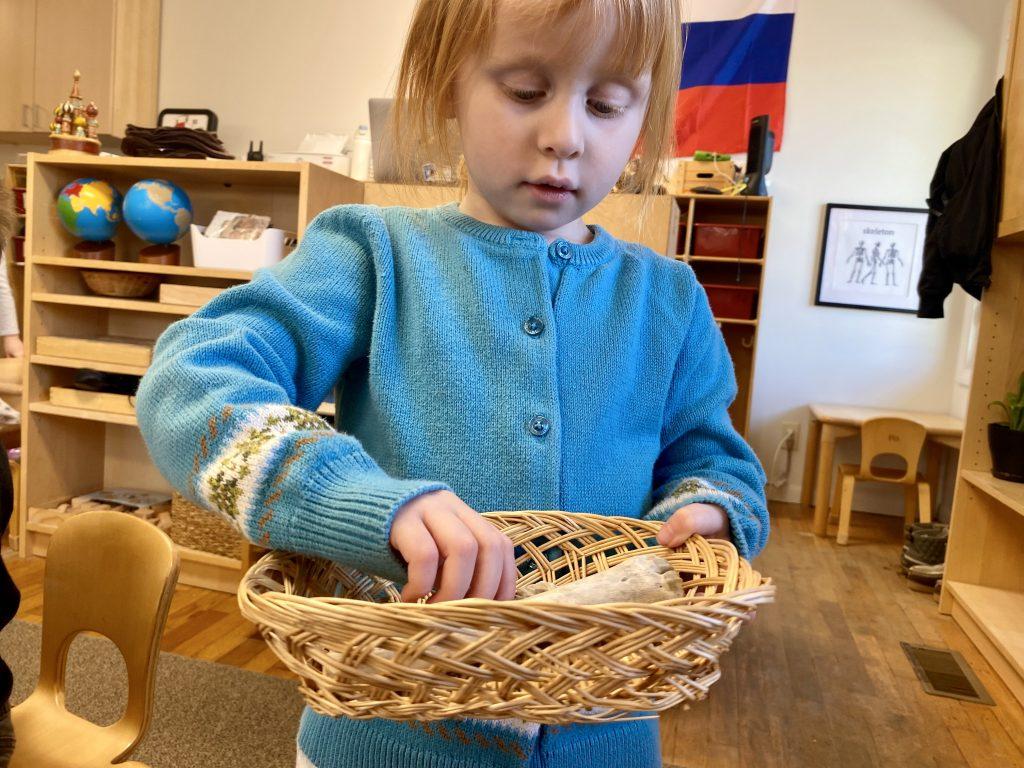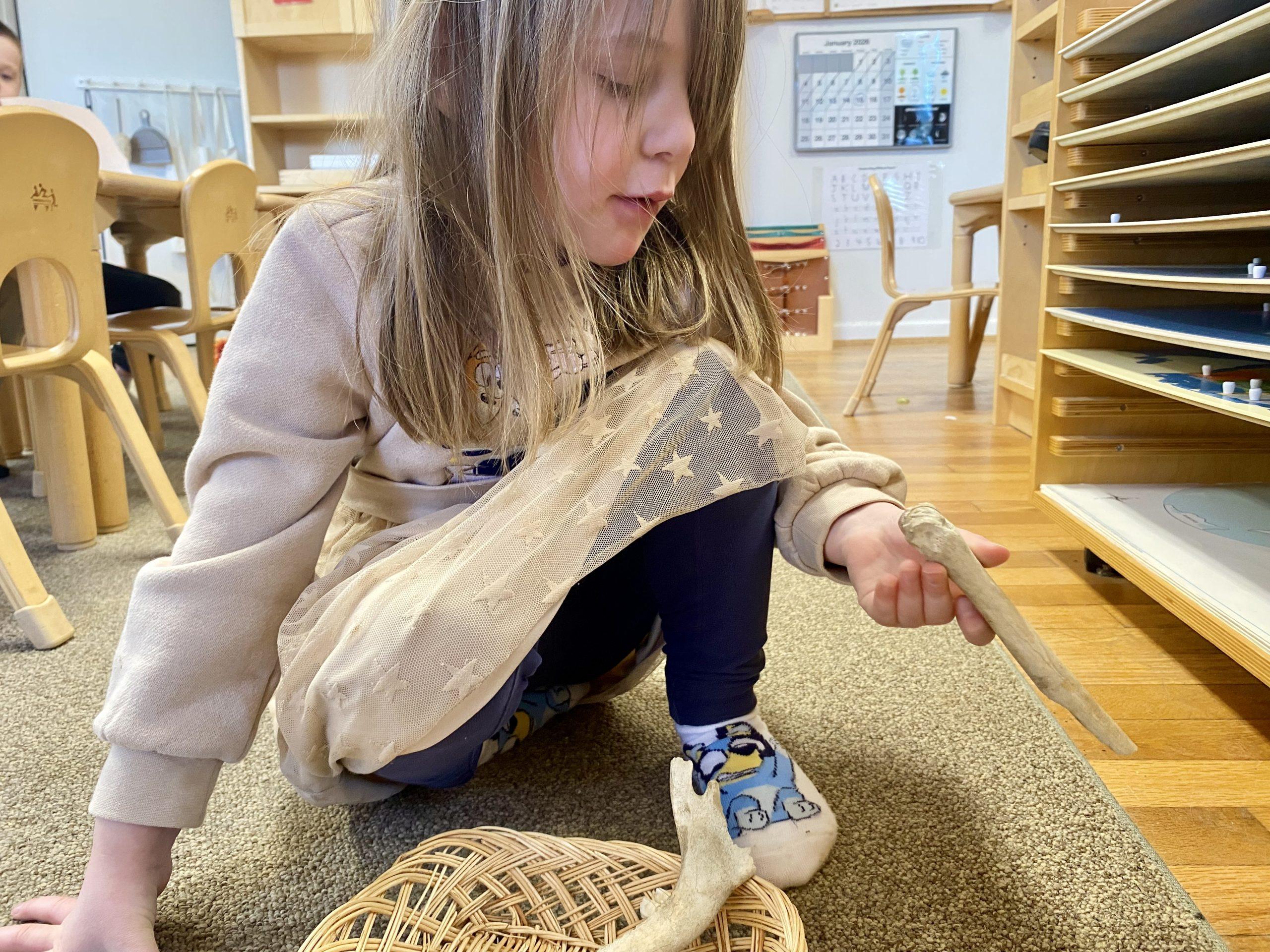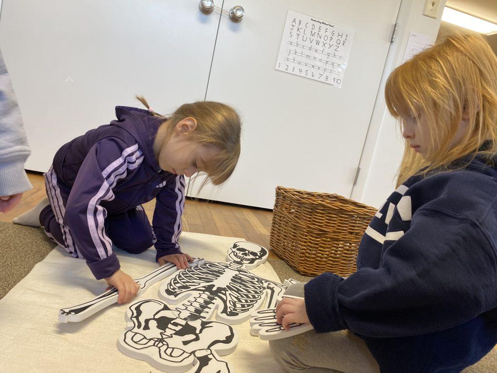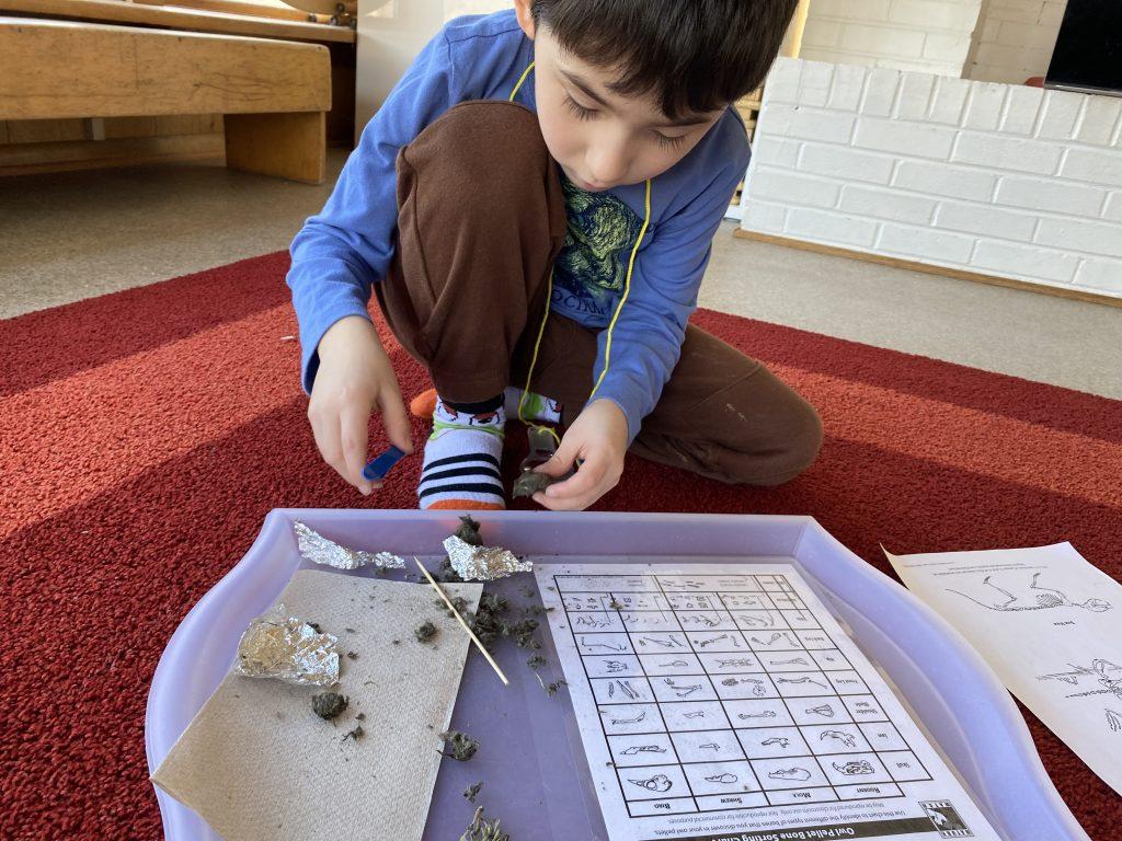 Primary students are studying the human body, turning their attention to bones. Works on the shelf include a life-size skeleton puzzle, a layered human body puzzle, and animal bones. Kindergarteners are digging deeper, literally! They are dissecting owl pellets, the compact mass of indigestible materials that owl’s regurgitate. Owl pellets contain fur, feathers, teeth, and bones of smaller animals. Kindergarteners match the contents of the pellet to a control chart to identify what they discovered in the owl pellet. Note that bones found in nature should always cleaned and sterilized before handling.